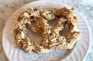 Puff pastry and German Muerbeteig dough pretzel coated with an apricot glaze and sliced almonds.