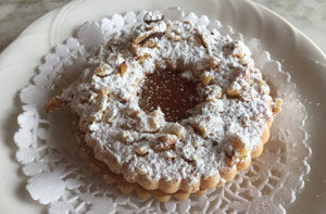 Linzer cookie with an apricot jam filling, dusted with icing sugar and roasted nuts.