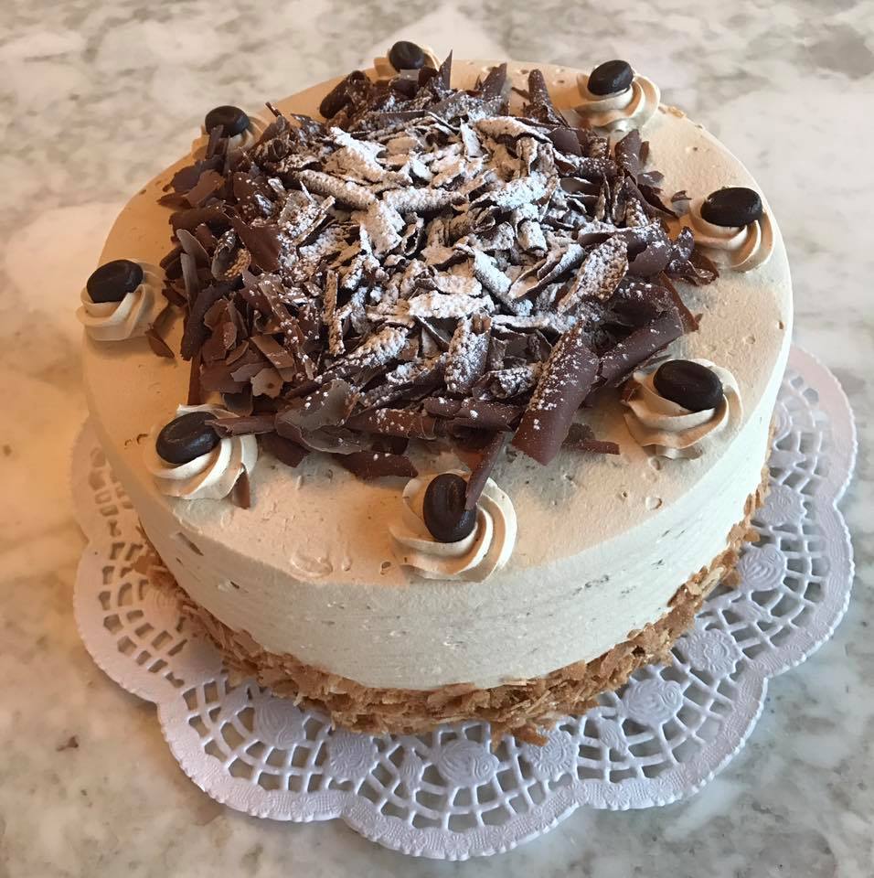 Layers of Sweet Gallery Royale Sponge, vanilla sponge, and mocha flavored whip cream, topped with chocolate shavings.