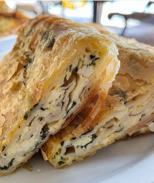 Phyllo pastry filled with savory cheese, spinach and cheese, or ground beef.
