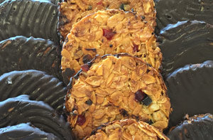 Sliced almonds, candied fruit, and caramelized sugar cookie dipped in dark chocolate on one side.