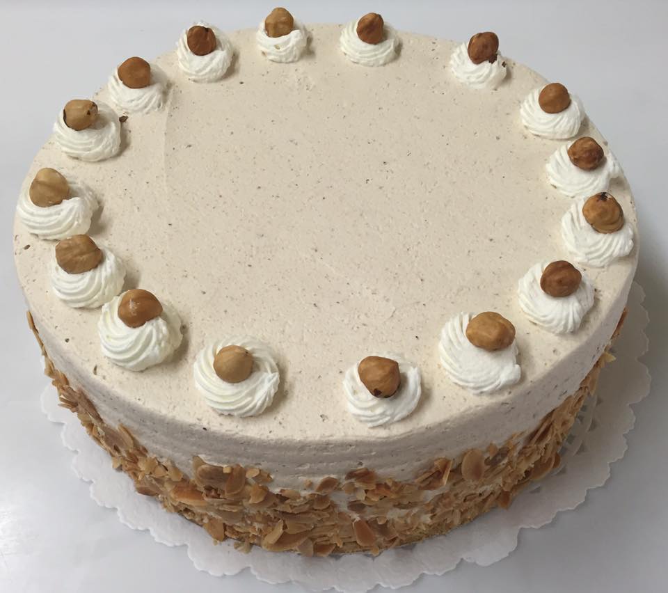 Layers of Sweet Gallery Royale sponge, vanilla sponge, and hazelnut flavored whip cream, topped with white chocolate shavings.