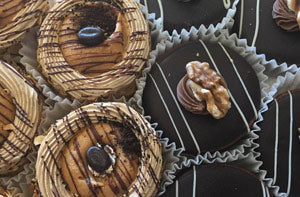 Two chocolate cookies with a chocolate buttercream and walnut puree center. Topped with chocolate or caramel and mocha buttercream.