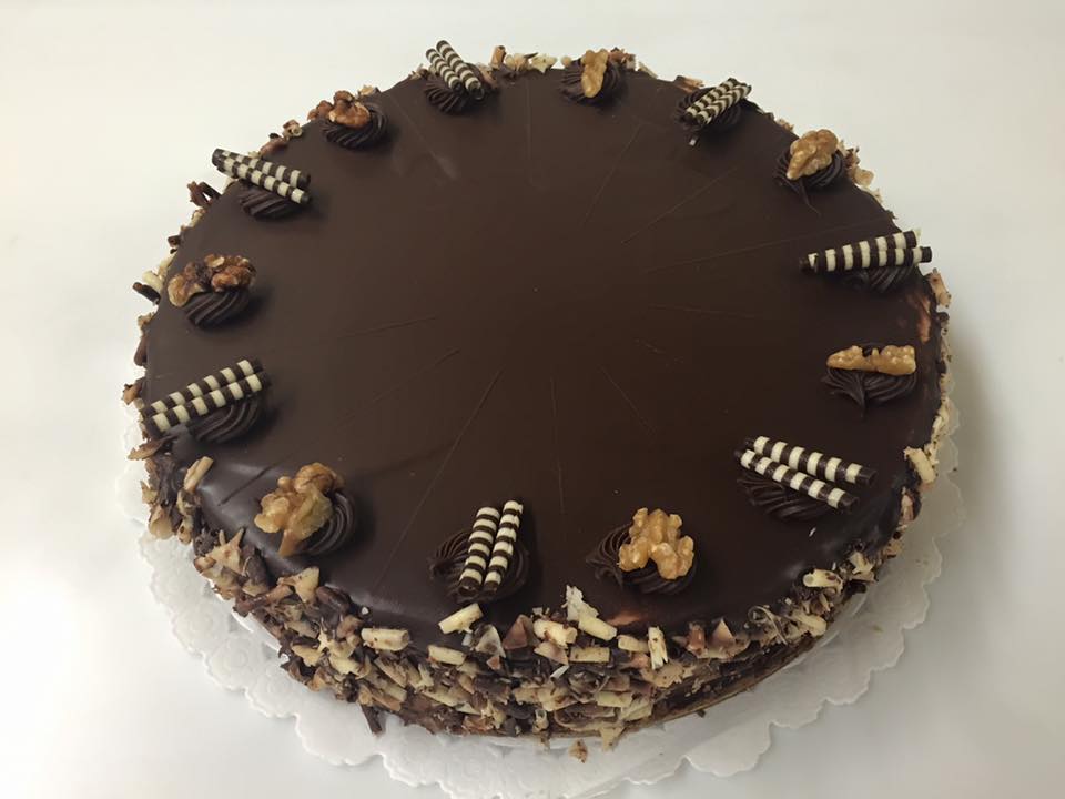 Layers of walnut sponge, mocha buttercream and chocolate buttercream, glazed in dark chocolate.